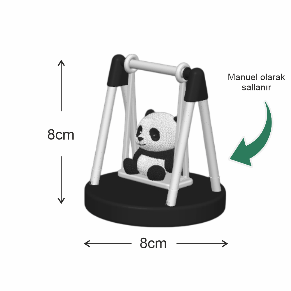 Çok şık ve çok sevimli salıncakta sallanan panda figürü, hediye yada kendi kullanımınız için mükemmel seçim. Masa üzerinde yada arabada kullanılabilecek plastik malzemeden üretilmiş figür, sallanan salıncak her ortama neşe ve hareketlilik getirecek.